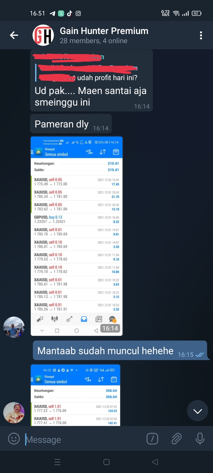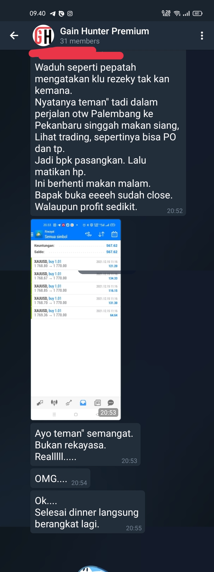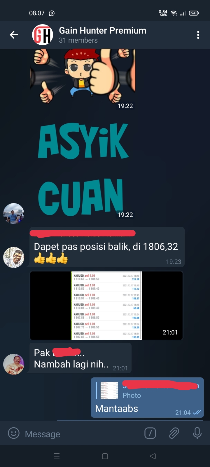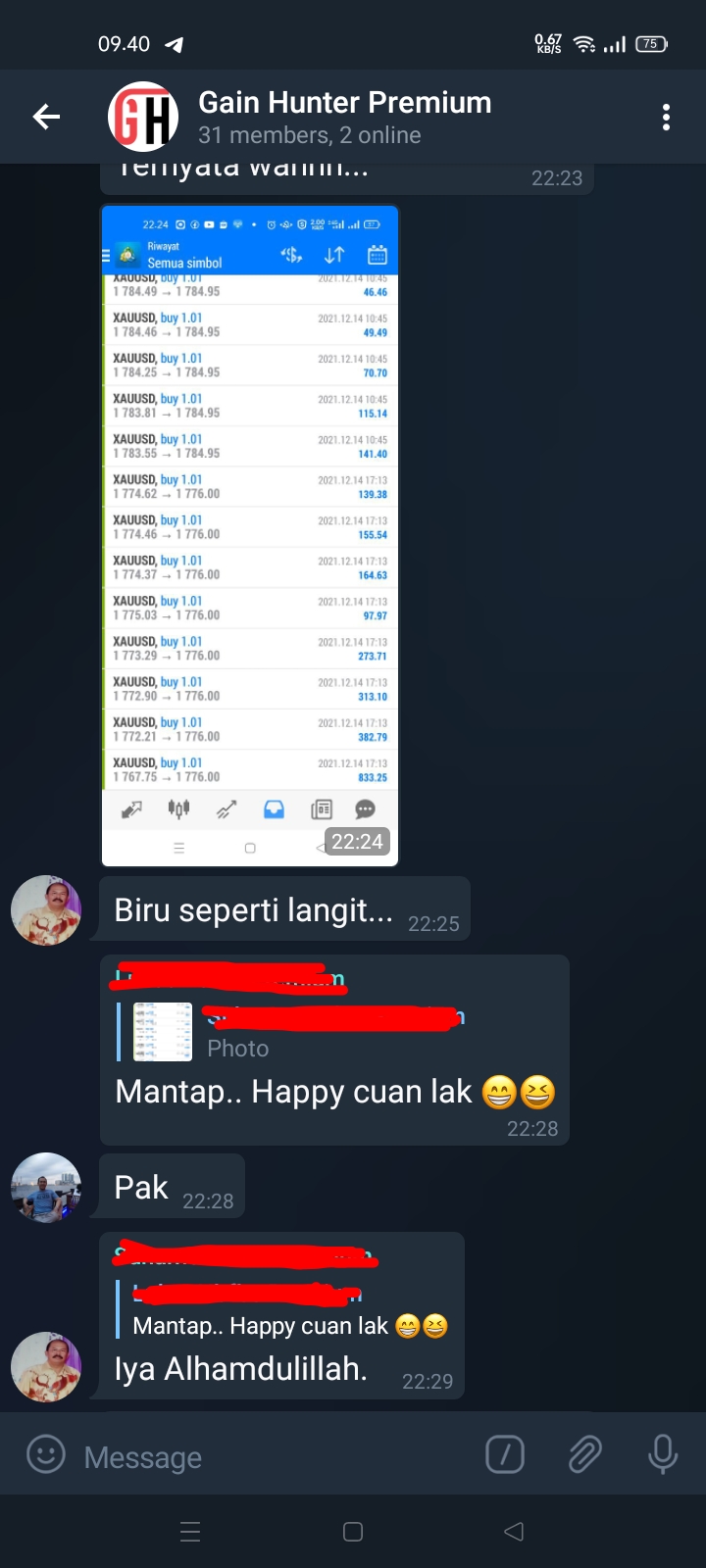 Saya liatin group Gain Hunter Mastery yang isinya adalah trader waras semua, bukan trader abal-abal. Ingat, trading forex tanpa ilmu yang sudah teruji adalah awal dari kehancuran finansial.