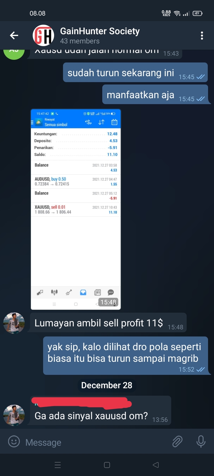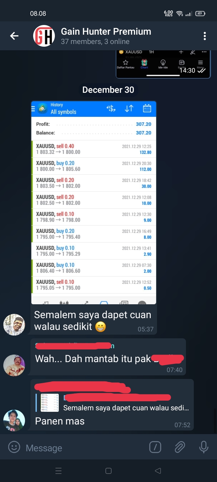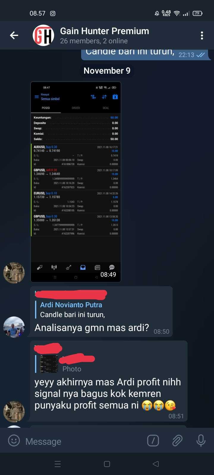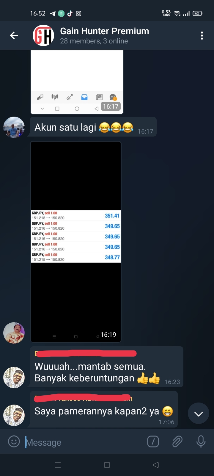 Saya liatin group Gain Hunter Mastery yang isinya adalah trader waras semua, bukan trader abal-abal. Ingat, trading forex tanpa ilmu yang sudah teruji adalah awal dari kehancuran finansial.