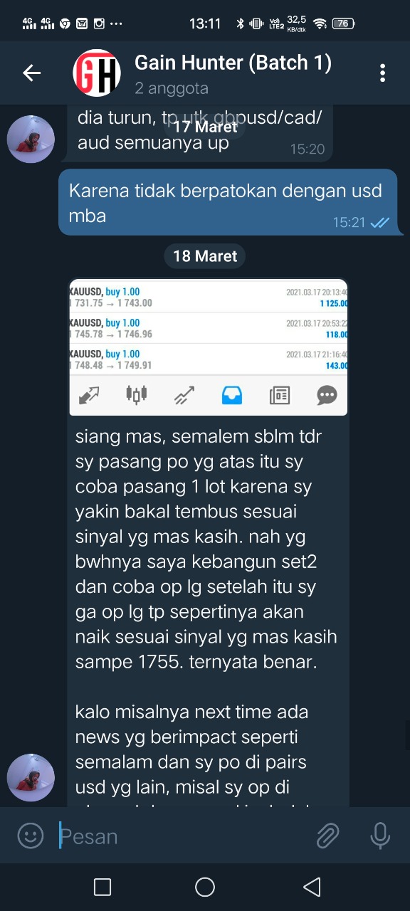 Layanan signal dari Gain Hunter bisa anda nikmati secara gratis selama 12 bulan dan kami berikan fasilitas tambahan seperti group diskusi premium dan e-course dalam bentuk video yang berisi 6 bab, dari pembasan mindset sampai dengan teknik trading semua dibahas dengan detail. Goalnya adalah agar anda menjadi trader profresional.
